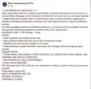 Mac’s Automotive and Tire Service Writer/Manager NEW