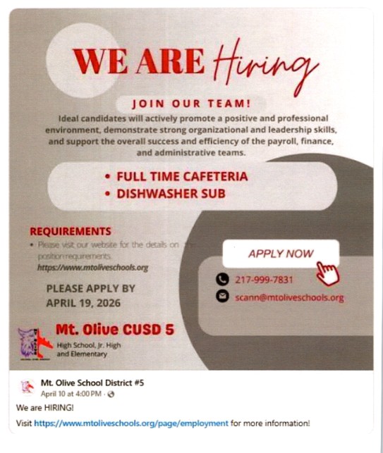 Mt. Olive CUSD #5 – Full time Cafeteria – Dishwasher Sub NEW
