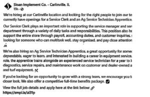 Sloan Implement Co. – Carlinville – Service Clerk and Ag Tech NEW