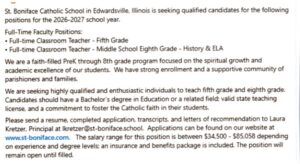 St. Boniface Catholic School – Positions Available NEW