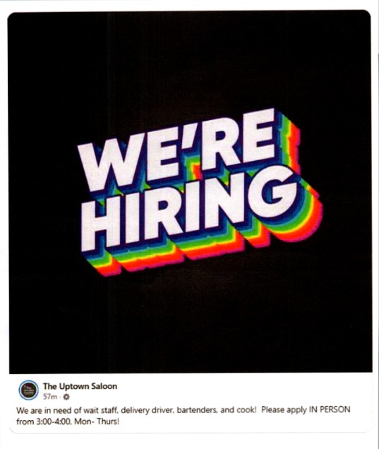 Uptown Saloon – Wait Staff, Delivery Driver, Bartenders, and Cook NEW