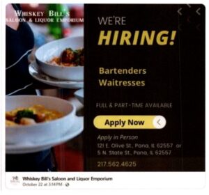 Whiskey Bills – Bartenders and Waitresses Needed NEW